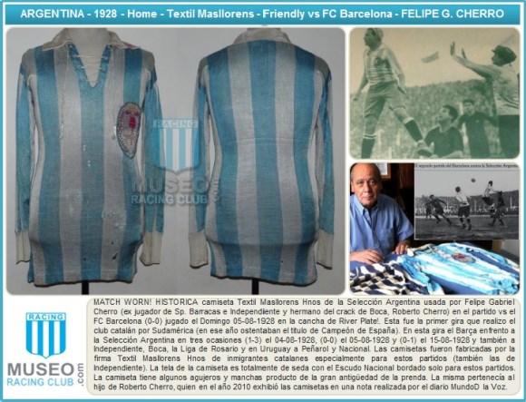 MATCH WORN! HISTORICA camiseta Textil Masllorens Hnos de la Selección Argentina usada por Felipe Gabriel Cherro (ex jugador de Sp. Barracas e Independiente y hermano del crack de Boca, Roberto Cherro) en el partido vs el FC Barcelona (0-0) jugado el Domingo 05-08-1928 en la cancha de River Plate!. Esta fue la primer gira que realizo el club catalán por Sudamérica (en ese año ostentaban el titulo de Campeón de España). En esta gira el Barça enfrento a la Selección Argentina en tres ocasiones (1-3) el 04-08-1928, (0-0) el 05-08-1928 y (0-1) el 15-08-1928 y también a Independiente, Boca, la Liga de Rosario y en Uruguay a Peñarol y Nacional. Las camisetas fueron fabricadas por la firma Textil Masllorens Hnos de inmigrantes catalanes especialmente para estos partidos (también las de Independiente). La tela de la camiseta es totalmente de seda con el Escudo Nacional bordado solo para estos partidos. La camiseta tiene algunos agujeros y manchas producto de la gran antigüedad de la prenda. La misma pertenecía al hijo de Roberto Cherro, quien en el año 2010 exhibió las camisetas en una nota realizada por el diario MundoD la Voz.
