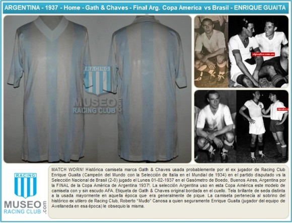 MATCH WORN! Histórica camiseta marca Gath & Chaves usada probablemente por el ex jugador de Racing Club Enrique Guaita (Campeón del Mundo con la Selección de Italia en el Mundial de 1934) en el partido disputado vs la Selección Nacional de Brasil (2-0) jugado el Lunes 01-02-1937 en el Gasómetro de Boedo, Buenos Aires, Argentina por la FINAL de la Copa América de Argentina 1937!. La selección Argentina uso en esta Copa América este modelo de camiseta con y sin escudo AFA. Etiqueta de Gath & Chaves original bordada en el cuello. Tela brillante de seda distinta a la usada mayormente en aquella época que era generalmente de pique. La camiseta pertenecía al sobrino del histórico ex utilero de Racing Club, Roberto “Mudo” Canosa a quien seguramente Enrique Guaita (jugador del equipo de Avellaneda en esa época) le obsequio la misma.