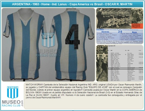 MATCH WORN!!! Camiseta de la Selección Nacional Argentina IND. ARG. original USADA por Oscar Raimundo Martín, ex jugador y CAPITÁN del emblemático equipo del Racing Club “EQUIPO DE JOSÉ” con el cual se consagro Campeón del Mundo, siendo el primer equipo argentino en lograrlo!!! Camiseta usada por Oscar Martín en la COPA AMÉRICA de BOLIVIA 1963!!! Usada en el partido disputado vs la Selección Nacional de Brasil (3-0) en el Estadio Hernando Siles de La Paz el 24-03-1963!?. Cuello en V!!!. Numero 4 de cuero cosido!!. La camiseta fue conseguida y entregada por el yerno de Oscar Raimundo Martín!!!!.
