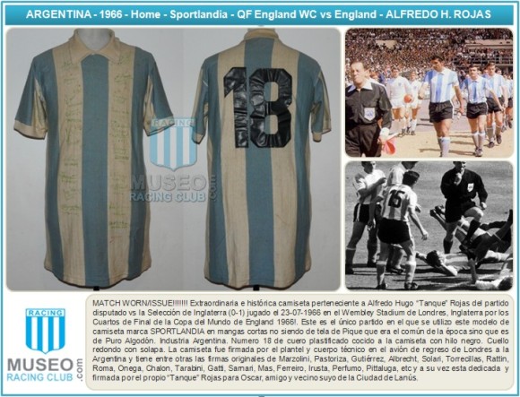 MATCH WORN/ISSUE!!!!!!! Extraordinaria e histórica camiseta perteneciente a Alfredo Hugo “Tanque” Rojas del partido disputado vs la Selección de Inglaterra (0-1) jugado el 23-07-1966 en el Wembley Stadium de Londres, Inglaterra por los Cuartos de Final de la Copa del Mundo de England 1966!. Este es el único partido en el que se utilizo este modelo de camiseta marca SPORTLANDIA en mangas cortas no siendo de tela de Pique que era el común de la época sino que es de Puro Algodón. Industria Argentina. Numero 18 de cuero plastificado cocido a la camiseta con hilo negro. Cuello redondo con solapa. La camiseta fue firmada por el plantel y cuerpo técnico en el avión de regreso de Londres a la Argentina y tiene entre otras las firmas originales de Marzolini, Pastoriza, Gutiérrez, Albrecht, Solari, Torrecillas, Rattin, Roma, Onega, Chalon, Tarabini, Gatti, Sarnari, Mas, Ferreiro, Irusta, Perfumo, Pittaluga, etc y a su vez esta dedicada y firmada por el propio “Tanque” Rojas para Oscar, amigo y vecino suyo de la Ciudad de Lanús.
