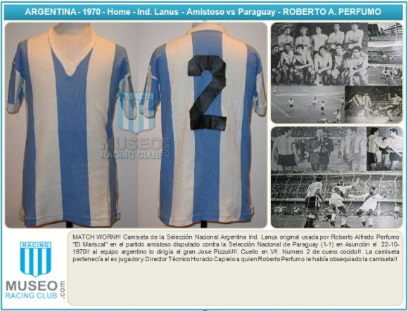 MATCH WORN!!! Camiseta de la Selección Nacional Argentina Ind. Lanus original usada por Roberto Alfredo Perfumo “El Mariscal” en el partido amistoso disputado contra la Selección Nacional de Paraguay (1-1) en Asunción el 22-10-1970!! al equipo argentino lo dirigía el gran Jose Pizzuti!!!. Cuello en V!!. Numero 2 de cuero cocido!!. La camiseta pertenecía al ex jugador y Director Técnico Horacio Capielo a quien Roberto Perfumo le había obsequiado la camiseta!!.