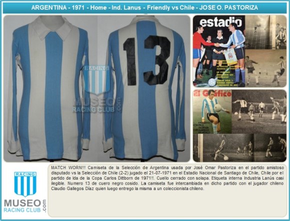 MATCH WORN!!! Camiseta de la Selección de Argentina usada por José Omar Pastoriza en el partido amistoso disputado vs la Selección de Chile (2-2) jugado el 21-07-1971 en el Estadio Nacional de Santiago de Chile, Chile por el partido de Ida de la Copa Carlos Dittborn de 1971!!. Cuello cerrado con solapa. Etiqueta interna Industria Lanús casi ilegible. Numero 13 de cuero negro cosido. La camiseta fue intercambiada en dicho partido con el jugador chileno Claudio Gallegos Díaz quien luego entrego la misma a un coleccionista chileno.