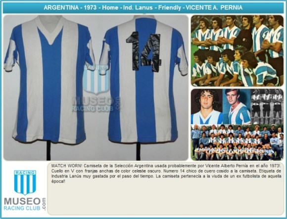 MATCH WORN! Camiseta de la Selección Argentina usada probablemente por Vicente Alberto Pernía en el año 1973!. Cuello en V con franjas anchas de color celeste oscuro. Numero 14 chico de cuero cosido a la camiseta. Etiqueta de Industria Lanús muy gastada por el paso del tiempo. La camiseta pertenecía a la viuda de un ex futbolista de aquella época!!