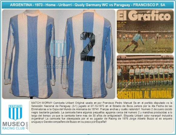 Camiseta usada por “Pancho” Sa en el partido vs Paraguay en 1973 por las Eliminatorias a la Copa del Mundo Germany 1974!.