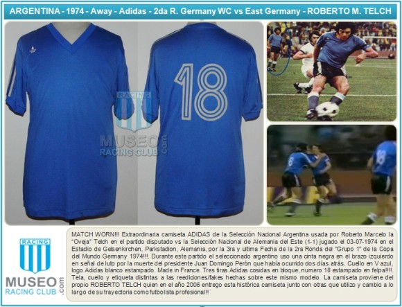 MATCH WORN!!! Extraordinaria camiseta ADIDAS de la Selección Nacional Argentina usada por Roberto Marcelo la “Oveja” Telch en el partido disputado vs la Selección Nacional de Alemania del Este (1-1) jugado el 03-07-1974 en el Estadio de Gelsenkirchen, Parkstadion, Alemania, por la 3ra y ultima Fecha de la 2ra Ronda del “Grupo 1” de la Copa del Mundo Germany 1974!!!. Durante este partido el seleccionado argentino uso una cinta negra en el brazo izquierdo en señal de luto por la muerte del presidente Juan Domingo Perón que había ocurrido dos días atrás. Cuello en V azul, logo Adidas blanco estampado. Made in France. Tres tiras Adidas cosidas en bloque, numero 18 estampado en felpa!!!!. Tela, cuello y etiqueta distintas a las reediciones/fakes hechas sobre este mismo modelo. La camiseta proviene del propio ROBERTO TELCH quien en el año 2006 entrego esta histórica camiseta junto con otras que utilizo y cambio a lo largo de su trayectoria como futbolista profesional!!.