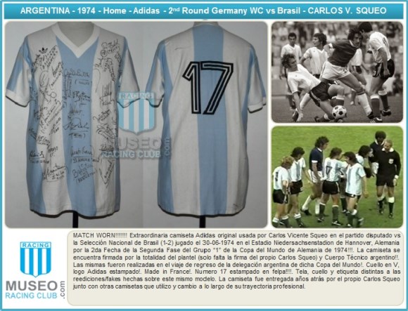 MATCH WORN!!!!!!! Extraordinaria camiseta Adidas original usada por Carlos Vicente Squeo en el partido disputado vs la Selección Nacional de Brasil (1-2) jugado el 30-06-1974 en el Estadio Niedersachsenstadion de Hannover, Alemania por la 2da Fecha de la Segunda Fase del Grupo “1” de la Copa del Mundo de Alemania de 1974!!!. La camiseta se encuentra firmada por la totalidad del plantel (solo falta la firma del propio Carlos Squeo) y Cuerpo Técnico argentino!!. Las mismas fueron realizadas en el viaje de regreso de la delegación argentina de dicha Copa del Mundo!. Cuello en V, logo Adidas estampado!. Made in France!. Numero 17 estampado en felpa!!!!. Tela, cuello y etiqueta distintas a las reediciones/fakes hechas sobre este mismo modelo. La camiseta fue entregada años atrás por el propio Carlos Squeo junto con otras camisetas que utilizo y cambio a lo largo de su trayectoria profesional.