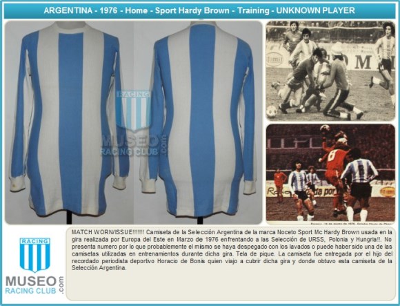 MATCH WORN/ISSUE!!!!!!! Camiseta de la Selección Argentina de la marca Noceto Sport Mc Hardy Brown usada en la gira realizada por Europa del Este en Marzo de 1976 enfrentando a las Selección de URSS, Polonia y Hungria!!. No presenta numero por lo que probablemente el mismo se haya despegado con los lavados o puede haber sido una de las camisetas utilizadas en entrenamientos durante dicha gira. Tela de pique. La camiseta fue entregada por el hijo del recordado periodista deportivo Horacio de Bonis quien viajo a cubrir dicha gira y donde obtuvo esta camiseta de la Selección Argentina.