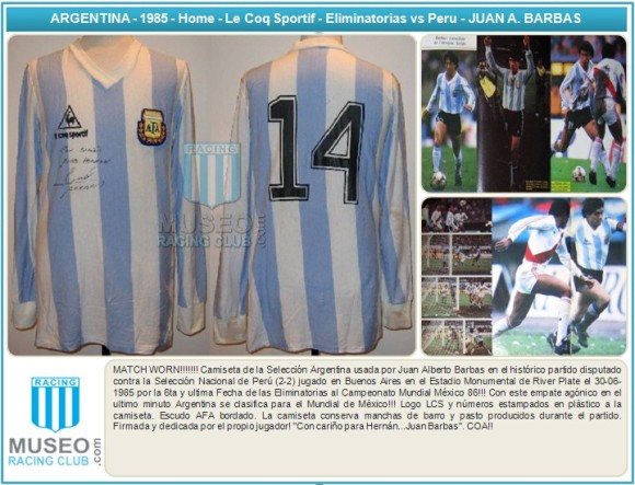 MATCH WORN!!!!!!! Camiseta de la Selección Argentina usada por Juan Alberto Barbas en el histórico partido disputado contra la Selección Nacional de Perú (2-2) jugado en Buenos Aires en el Estadio Monumental de River Plate el 30-06-1985 por la 6ta y ultima Fecha de las Eliminatorias al Campeonato Mundial México 86!!! Con este empate agónico en el ultimo minuto Argentina se clasifica para el Mundial de México!!! Logo LCS y números estampados en plástico a la camiseta. Escudo AFA bordado. La camiseta conserva manchas de barro y pasto producidos durante el partido. Firmada y dedicada por el propio jugador! “Con cariño para Hernán…Juan Barbas”. COA!!