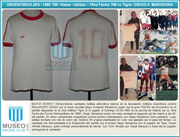 MATCH WORN!!!! Extraordinaria camiseta Adidas alternativa blanca de la Asociación Atlética Argentinos Juniors REALMENTE USADA por el crack mundial Diego Armando Maradona (quien fue la gran FIGURA del encuentro) en el partido disputado vs el Club Atlético Tigre (2-1) jugado el Domingo 25-05-1980 en la cancha de Atlanta por la 19na Fecha del Torneo Metropolitano de 1980!. Diego Maradona anoto con esta camiseta el segundo gol del match a los 56’ del partido. En dicho campeonato Argentinos Juniors termino Subcampeón con Diego Maradona como goleador!. Logo adidas bordado con hilo de color rojo. Número 10 original estampado en color rojo gastado por el paso del tiempo. La camiseta fue intercambiada a la finalización del partido por el propio Diego Maradona con el jugador de Tigre, Oscar Alfredo Márquez, quien entrego personalmente la misma. Con COA firmado por Oscar Márquez y fotos del ex jugador entregando la camiseta!.
