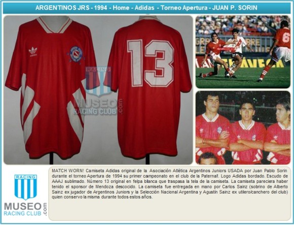MATCH WORN! Camiseta Adidas original de la Asociación Atlética Argentinos Juniors USADA por Juan Pablo Sorin durante el torneo Apertura de 1994 su primer campeonato en el club de la Paternal!. Logo Adidas bordado. Escudo de AAAJ sublimado. Número 13 original en felpa blanca que traspasa la tela de la camiseta. La camiseta pareciera haber tenido el sponsor de Mendoza descocido. La camiseta fue entregada en mano por Carlos Sainz (sobrino de Alberto Sainz ex jugador de Argentinos Juniors y la Selección Nacional Argentina y Agustín Sainz ex utilero/canchero del club) quien conservo la misma durante todos estos años.