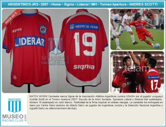 MATCH WORN! Camiseta marca Signia de la Asociación Atlética Argentinos Juniors USADA por el jugador uruguayo Andrés Scotti en el Toreno Apertura 2007!. Escudo de la AAAJ bordado. Sponsors Liderar y Medical Hair sublimados. Número 19 estampado en color blanco. Publicidad de la firma Inquinat en ambas mangas. La camiseta fue entregada en mano por Carlos Sainz (sobrino de Alberto Sainz ex jugador de Argentinos Juniors y la Selección Nacional Argentina y Agustín Sainz ex utilero/canchero del club).