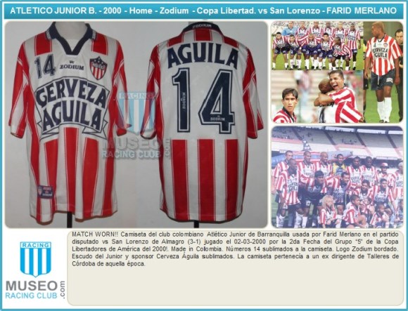 MATCH WORN!! Camiseta del club colombiano Atlético Junior de Barranquilla usada por Farid Merlano en el partido disputado vs San Lorenzo de Almagro (3-1) jugado el 02-03-2000 por la 2da Fecha del Grupo “5” de la Copa Libertadores de América del 2000!. Made in Colombia. Números 14 sublimados a la camiseta. Logo Zodium bordado. Escudo del Junior y sponsor Cerveza Águila sublimados. La camiseta pertenecía a un ex dirigente de Talleres de Córdoba de aquella época