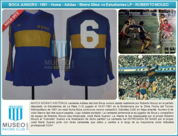 MATCH WORN!!!! HISTÓRICA camiseta Adidas del club Boca Juniors usada realmente por Roberto Mouzo en el partido disputado vs Estudiantes de La Plata (1-0) jugado el 19-07-1981 en la Bombonera por la 30ma Fecha del Torneo Metropolitano de 1981 (en esta fecha Boca Juniors se corono campeón!). Estrellas CABJ en felpa amarilla. Numero 6 de color blanco tipo tela suave pegada. Logo Adidas bordado!. La camiseta pertenecía al ex jugador de Boca y compañero de equipo de Roberto Mouzo esa temporada, José María Suarez!. La misma le fue obsequiada por el propio Roberto Mouzo al “Colorado” Suarez a la finalización de dicho partido!! La camiseta fue ENTREGADA EN MANO por el propio José María Suarez junto con otras camisetas que utilizo y cambio a lo largo de su trayectoria como futbolista profesional!! COA!!