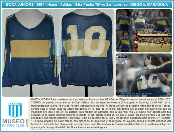 MATCH WORN! Rara camiseta del Club Atlético Boca Juniors USADA por Diego Armando Maradona en el SEGUNDO TIEMPO del partido disputado vs el Club Atlético San Lorenzo de Almagro (4-0) jugado el Domingo 21-06-1981 en la Bombonera por la 24ta Fecha del Torneo Metropolitano de 1981!. Boca Juniors se proclamo campeón de dicho Torneo siendo este el único titulo de Diego Maradona en el club de la ribera. Maradona fue el autor del cuarto gol con un magnifico tiro libre a los 88’ del partido. Este modelo de camiseta con la tela mas fina y el cuello muy abierto solo fue utilizado unos pocos partidos (distinto al usado en las ultimas fecha en las que el cuello era mas cerrado y la tela mas pesada). Logo adidas bordado. Las letras CABJ se salieron por el uso y los lavados quedando solo la letra “A”. Número 10 original pegado en color blanco con manchas de humedad y despegado en algunas partes producto del paso del tiempo. La camiseta fue obsequiada por el propio Diego Maradona a la finalización del partido en el vestuario al hijo del que era jefe de seguridad del club Boca Juniors en aquella época.