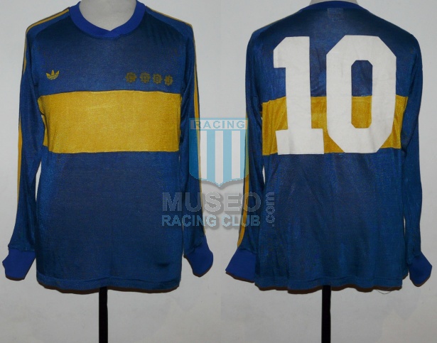 MATCH WORN!!!! HISTÓRICA camiseta Adidas de Boca Juniors usada realmente por el astro Diego Armando Maradona en el PRIMER TIEMPO del partido vs Racing Club (1-1) jugado el 15-08-1981 en la Bombonera por la 34ta Fecha del Torneo Metropolitano de 1981 (en esta fecha Boca se corono campeón, siendo este el único titulo conseguido por Diego Maradona en el club)!!.