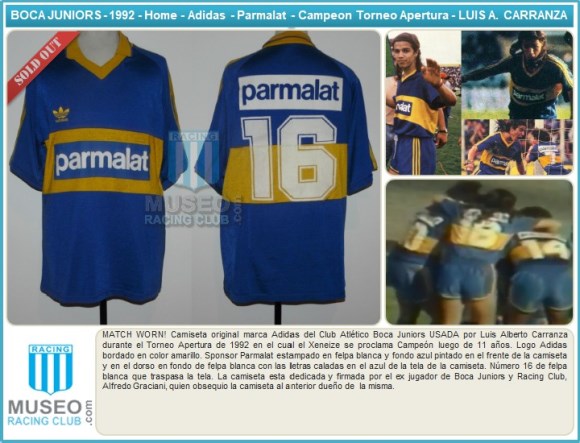 MATCH WORN! Camiseta original marca Adidas del Club Atlético Boca Juniors USADA por Luis Alberto Carranza durante el Torneo Apertura de 1992 en el cual el Xeneize se proclama Campeón luego de 11 años. Logo Adidas bordado en color amarillo. Sponsor Parmalat estampado en felpa blanca y fondo azul pintado en el frente de la camiseta y en el dorso en fondo de felpa blanca con las letras caladas en el azul de la tela de la camiseta. Número 16 de felpa blanca que traspasa la tela. La camiseta esta dedicada y firmada por el ex jugador de Boca Juniors y Racing Club, Alfredo Graciani, quien obsequio la camiseta al anterior dueño de  la misma.