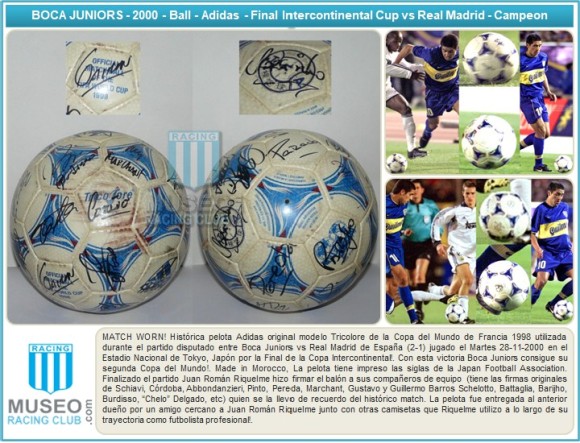 MATCH WORN! Histórica pelota Adidas original modelo Tricolore de la Copa del Mundo de Francia 1998 utilizada durante el partido disputado entre Boca Juniors vs Real Madrid de España (2-1) jugado el Martes 28-11-2000 en el Estadio Nacional de Tokyo, Japón por la Final de la Copa Intercontinental!. Con esta victoria Boca Juniors consigue su segunda Copa del Mundo!. Made in Morocco, La pelota tiene impreso las siglas de la Japan Football Association. Finalizado el partido Juan Román Riquelme hizo firmar el balón a sus compañeros de equipo (tiene las firmas originales de Schiavi, Córdoba, Abbondanzieri, Pinto, Pereda, Marchant, Gustavo y Guillermo Barros Schelotto, Battaglia, Barijho, Burdisso, “Chelo” Delgado, etc) quien se la llevo de recuerdo del histórico match. La pelota fue entregada al anterior dueño por un amigo cercano a Juan Román Riquelme junto con otras camisetas que Riquelme utilizo a lo largo de su trayectoria como futbolista profesional!.