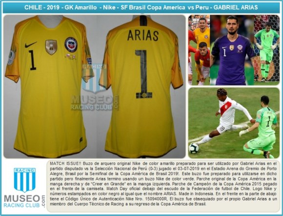 MATCH ISSUE!! Buzo de arquero original Nike de color amarillo preparado para ser utilizado por Gabriel Arias en el partido disputado vs la Selección Nacional de Perú (0-3) jugado el 03-07-2019 en el Estadio Arena do Gremio de Porto Alegre, Brasil por la Semifinal de la Copa América de Brasil 2019!. Este buzo fue preparado para utilizarse en dicho partido pero finalmente Arias termino usando un buzo Nike de color verde. Parche original de la Copa América en la manga derecha y de “Creer en Grande” en la manga izquierda. Parche de Campeón de la Copa América 2015 pegado en el frente de la camiseta. Match Day oficial debajo del escudo de la Federación de futbol de Chile. Logo Nike y números estampados en color negro al igual que el nombre ARIAS. Made in Indonesia. En el frente en la parte de abajo tiene el Código Único de Autenticación Nike Nro. 15094000R, El buzo fue obsequiado por el propio Gabriel Arias a un miembro del Cuerpo Técnico de Racing a su regreso de la Copa América de Brasil.