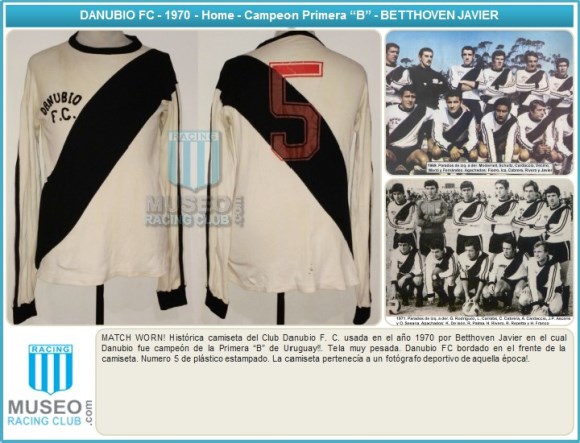 MATCH WORN! Histórica camiseta del Club Danubio F. C. usada en el año 1970 por Betthoven Javier en el cual Danubio fue campeón de la Primera “B” de Uruguay!!. Tela muy pesada. Danubio FC bordado en el frente de la camiseta. Numero 5 de plástico estampado. La camiseta pertenecía a un fotógrafo deportivo de aquella época!.