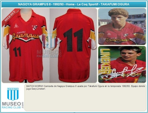MATCH WORN!! Camiseta de Nagoya Grampus 8 usada por Takafumi Ogura en la temporada 1992/93. Equipo donde jugo Gary Lineker!.