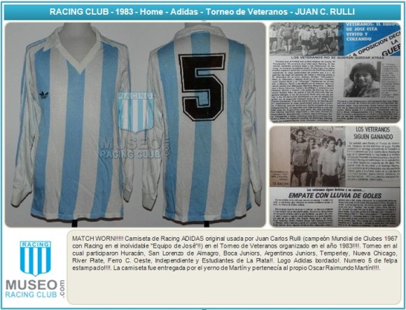MATCH WORN!!!!! Camiseta de Racing ADIDAS original usada por Juan Carlos Rulli (campeón Mundial de Clubes 1967 con Racing en el inolvidable “Equipo de José”!!) en el Torneo de Veteranos organizado en el año 1983!!!!. Torneo en al cual participaron Huracán, San Lorenzo de Almagro, Boca Juniors, Argentinos Juniors, Temperley, Nueva Chicago, River Plate, Ferro C. Oeste, Independiente y Estudiantes de La Plata!!. Logo Adidas bordado!. Numero 5 de felpa estampado!!!!. La camiseta fue entregada por el yerno de Martín y pertenecía al propio Oscar Raimundo Martín!!!!.