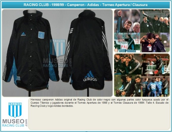 Hermoso camperon Adidas original de Racing Club de color negro con algunas partes color turquesa usado por el Cuerpo Técnico y jugadores durante el Torneo Apertura de 1998 y el Torneo Clausura de 1999!. Talle 4. Escudo de Racing Club y logo Adidas bordados.