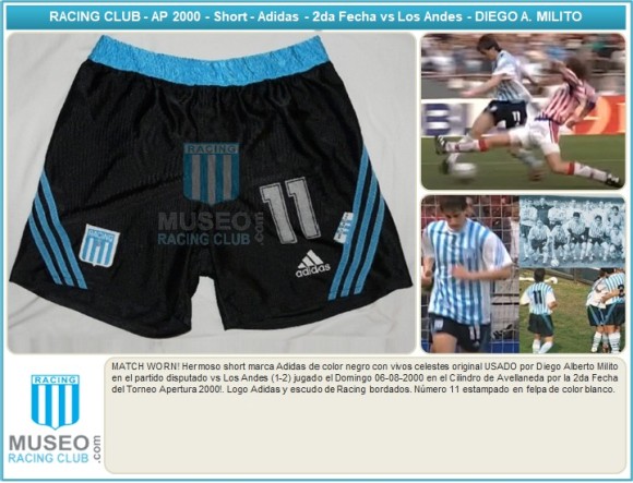 MATCH WORN! Hermoso short marca Adidas de color negro con vivos celestes original USADO por Diego Alberto Milito en el partido disputado vs Los Andes (1-2) jugado el Domingo 06-08-2000 en el Cilindro de Avellaneda por la 2da Fecha del Torneo Apertura 2000!. Logo Adidas y escudo de Racing bordados. Número 11 estampado en felpa de color blanco.