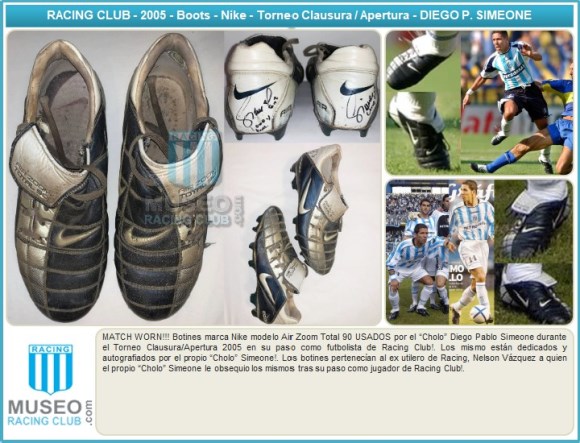 MATCH WORN!!! Botines marca Nike modelo Air Zoom Total 90 USADOS por el “Cholo” Diego Pablo Simeone durante el Torneo Clausura/Apertura 2005 en su paso como futbolista de Racing Club!. Los mismo están dedicados y autografiados por el propio “Cholo” Simeone!. Los botines pertenecían al ex utilero de Racing, Nelson Vázquez a quien el propio “Cholo” Simeone le obsequio los mismos tras su paso como jugador de Racing Club!.