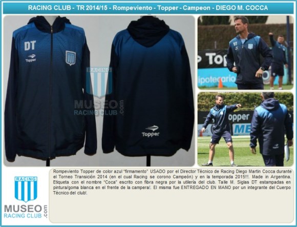 Rompeviento Topper de color azul “firmamento” USADO por el Director Técnico de Racing Diego Martin Cocca durante el Torneo Transición 2014 (en el cual Racing se corono Campeón) y en la temporada 2015!!!. Made in Argentina. Etiqueta con el nombre “Coca” escrito con fibra negra por la utilería del club. Talle M. Siglas DT estampadas en pintura/goma blanca en el frente de la campera!. El misma fue ENTREGADO EN MANO por un integrante del Cuerpo Técnico del club!.
