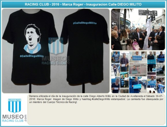 Remera utilizada el día de la inauguración de la calle Diego Alberto Milito en la Ciudad de Avellaneda el Sábado 30-07-2016!. Marca Roger. Imagen de Diego Milito y hashtag #calleDiegoMilito estampados!. La camiseta fue obsequiada por un miembro del Cuerpo Técnico de Racing!.