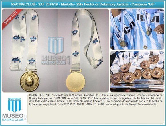 Medalla ORIGINAL entregada por la Superliga Argentina de Fútbol a los jugadores, Cuerpo Técnico y dirigencia de Racing Club por ser CAMPEON de la SAF 2018/19!. Estas medallas fueron entregadas a la finalización del partido disputado vs Defensa y Justicia (1-1) jugado el Domingo 07-04-2019 en el Cilindro de Avellaneda por la 25ta Fecha de la Superliga Argentina de Futbol 2018/19!!. ENTREGADA EN MANO por un integrante del Cuerpo Técnico del club!.