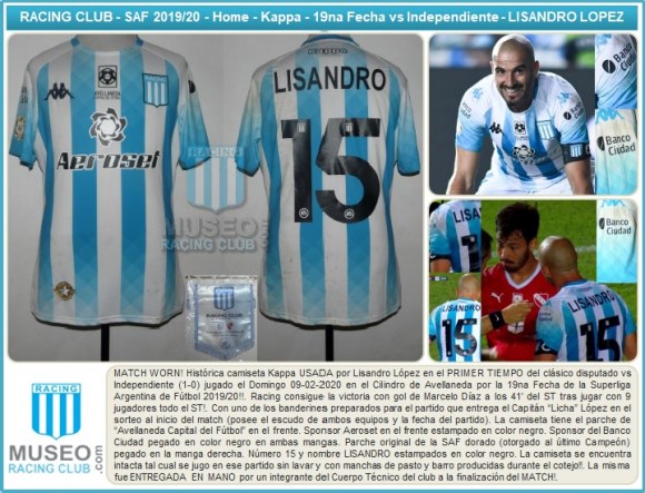 Camiseta Kappa usada por el “Licha” Lopez en el PRIMER TIEMPO del clásico vs Independiente por la 19na Fecha de la Superliga Argentina de Futbol 2019/20!. Con uno de los banderines que entrega el Capitan “Licha” Lopez en el sorteo antes del inicio del partido!.