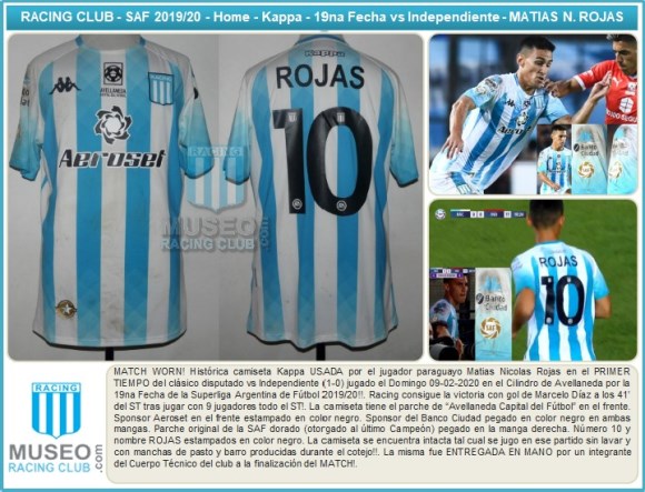 MATCH WORN! Histórica camiseta Kappa USADA por el jugador paraguayo Matias Nicolas Rojas en el PRIMER TIEMPO del clásico disputado vs Independiente (1-0) jugado el Domingo 09-02-2020 en el Cilindro de Avellaneda por la 19na Fecha de la Superliga Argentina de Fútbol 2019/20!!. Racing consigue la victoria con gol de Marcelo Díaz a los 41’ del ST tras jugar con 9 jugadores todo el ST!. La camiseta tiene el parche de “Avellaneda Capital del Fútbol” en el frente. Sponsor Aeroset en el frente estampado en color negro. Sponsor del Banco Ciudad pegado en color negro en ambas mangas. Parche original de la SAF dorado (otorgado al último Campeón) pegado en la manga derecha. Número 10 y nombre ROJAS estampados en color negro. La camiseta se encuentra intacta tal cual se jugo en ese partido sin lavar y con manchas de pasto y barro producidas durante el cotejo!!. La misma fue ENTREGADA EN MANO por un integrante del Cuerpo Técnico del club a la finalización del MATCH!.