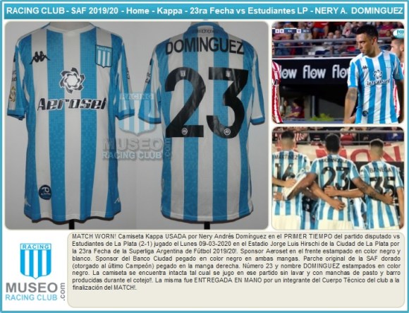 MATCH WORN! Camiseta Kappa USADA por Nery Andrés Domínguez en el PRIMER TIEMPO del partido disputado vs Estudiantes de La Plata (2-1) jugado el Lunes 09-03-2020 en el Estadio Jorge Luis Hirschi de la Ciudad de La Plata por la 23ra Fecha de la Superliga Argentina de Fútbol 2019/20!. Sponsor Aeroset en el frente estampado en color negro y blanco. Sponsor del Banco Ciudad pegado en color negro en ambas mangas. Parche original de la SAF dorado (otorgado al último Campeón) pegado en la manga derecha. Número 23 y nombre DOMINGUEZ estampados en color negro. La camiseta se encuentra intacta tal cual se jugo en ese partido sin lavar y con manchas de pasto y barro producidas durante el cotejo!!. La misma fue ENTREGADA EN MANO por un integrante del Cuerpo Técnico del club a la finalización del MATCH!.