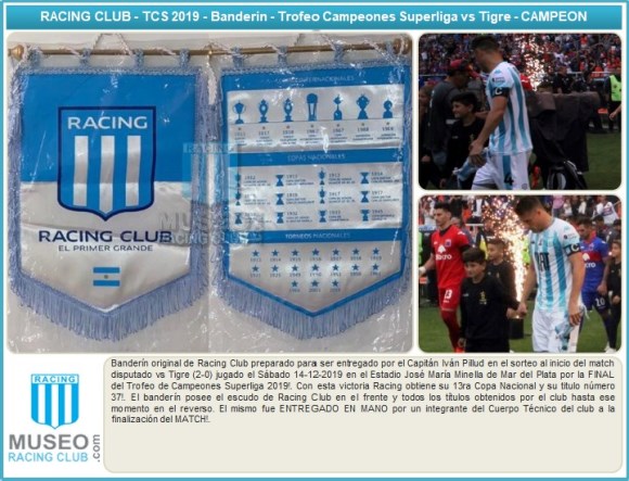 Banderín original de Racing Club preparado para ser entregado por el Capitán Iván Pillud en el sorteo al inicio del match disputado vs Tigre (2-0) jugado el Sábado 14-12-2019 en el Estadio José María Minella de Mar del Plata por la FINAL del Trofeo de Campeones Superliga 2019!. Con esta victoria Racing obtiene su 13ra Copa Nacional y su titulo número 37!. El banderín posee el escudo de Racing Club en el frente y todos los títulos obtenidos por el club hasta ese momento en el reverso. El mismo fue ENTREGADO EN MANO por un integrante del Cuerpo Técnico del club a la finalización del MATCH!.