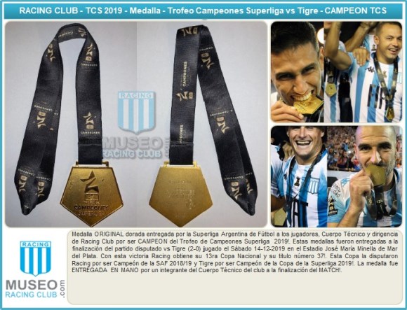 Medalla ORIGINAL dorada entregada por la Superliga Argentina de Fútbol a los jugadores, Cuerpo Técnico y dirigencia de Racing Club por ser CAMPEON del Trofeo de Campeones Superliga 2019!. Estas medallas fueron entregadas a la finalización del partido disputado vs Tigre (2-0) jugado el Sábado 14-12-2019 en el Estadio José María Minella de Mar del Plata. Con esta victoria Racing obtiene su 13ra Copa Nacional y su titulo número 37!. Esta Copa la disputaron Racing por ser Campeón de la SAF 2018/19 y Tigre por ser Campeón de la Copa de la Superliga 2019!. La medalla fue ENTREGADA EN MANO por un integrante del Cuerpo Técnico del club a la finalización del MATCH!.