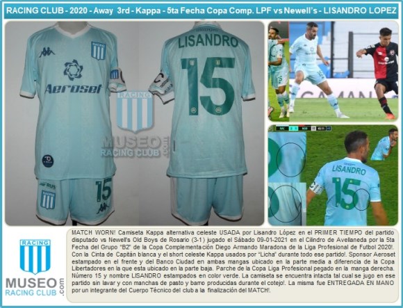 MATCH WORN! Camiseta Kappa alternativa celeste USADA por Lisandro López en el PRIMER TIEMPO del partido disputado vs Newell’s Old Boys de Rosario (3-1) jugado el Sábado 09-01-2021 en el Cilindro de Avellaneda por la 5ta Fecha del Grupo “B2” de la Copa Complementación Diego Armando Maradona de la Liga Profesional de Futbol 2020!. Con la Cinta de Capitán blanca y el short celeste Kappa usados por “Licha” durante todo ese partido!. Sponsor Aeroset estampado en el frente y del Banco Ciudad en ambas mangas ubicado en la parte media a diferencia de la Copa Libertadores en la que esta ubicado en la parte baja. Parche de la Copa Liga Profesional pegado en la manga derecha. Número 15 y nombre LISANDRO estampados en color verde. La camiseta se encuentra intacta tal cual se jugo en ese partido sin lavar y con manchas de pasto y barro producidas durante el cotejo!. La misma fue ENTREGADA EN MANO por un integrante del Cuerpo Técnico del club a la finalización del MATCH!.