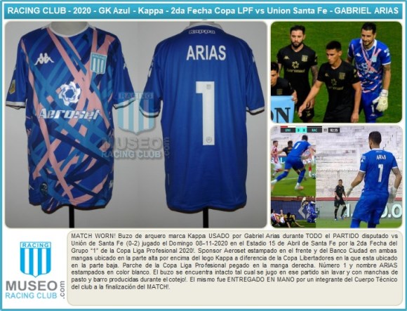 MATCH WORN! Buzo de arquero marca Kappa USADO por Gabriel Arias durante TODO el PARTIDO disputado vs Unión de Santa Fe (0-2) jugado el Domingo 08-11-2020 en el Estadio 15 de Abril de Santa Fe por la 2da Fecha del Grupo “1” de la Copa Liga Profesional 2020!. Sponsor Aeroset estampado en el frente y del Banco Ciudad en ambas mangas ubicado en la parte alta por encima del logo Kappa a diferencia de la Copa Libertadores en la que esta ubicado en la parte baja. Parche de la Copa Liga Profesional pegado en la manga derecha. Número 1 y nombre ARIAS estampados en color blanco. El buzo se encuentra intacto tal cual se jugo en ese partido sin lavar y con manchas de pasto y barro producidas durante el cotejo!. El mismo fue ENTREGADO EN MANO por un integrante del Cuerpo Técnico del club a la finalización del MATCH!.