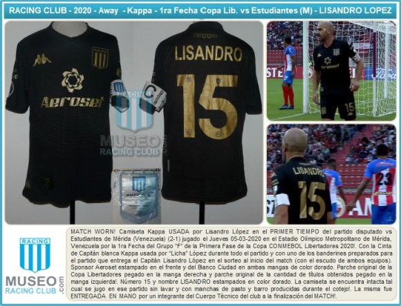 MATCH WORN! Camiseta Kappa USADA por Lisandro López en el PRIMER TIEMPO del partido disputado vs Estudiantes de Mérida (Venezuela) (2-1) jugado el Jueves 05-03-2020 en el Estadio Olímpico Metropolitano de Mérida, Venezuela por la 1ra Fecha del Grupo “F” de la Primera Fase de la Copa CONMEBOL Libertadores 2020!. Con la Cinta de Capitán blanca Kappa usada por “Licha” López durante todo el partido y con uno de los banderines preparados para el partido que entrega el Capitán Lisandro López en el sorteo al inicio del match (con el escudo de ambos equipos). Sponsor Aeroset estampado en el frente y del Banco Ciudad en ambas mangas de color dorado. Parche original de la Copa Libertadores pegado en la manga derecha y parche original de la cantidad de títulos obtenidos pegado en la manga izquierda!. Número 15 y nombre LISANDRO estampados en color dorado. La camiseta se encuentra intacta tal cual se jugo en ese partido sin lavar y con manchas de pasto y barro producidas durante el cotejo!. La misma fue ENTREGADA EN MANO por un integrante del Cuerpo Técnico del club a la finalización del MATCH!.