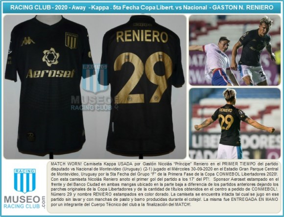 MATCH WORN! Camiseta Kappa USADA por Gastón Nicolás “Príncipe” Reniero en el PRIMER TIEMPO del partido disputado vs Nacional de Montevideo (Uruguay) (2-1) jugado el Miércoles 30-09-2020 en el Estadio Gran Parque Central de Montevideo, Uruguay por la 5ta Fecha del Grupo “F” de la Primera Fase de la Copa CONMEBOL Libertadores 2020!. Con esta camiseta Nicolás Reniero anoto el primer gol del partido a los 17’ del PT!. Sponsor Aeroset estampado en el frente y del Banco Ciudad en ambas mangas ubicado en la parte baja a diferencia de los partidos anteriores dejando los parches originales de la Copa Libertadores y de la cantidad de títulos obtenidos en el centro a pedido de CONMEBOL!. Número 29 y nombre RENIERO estampados en color dorado. La camiseta se encuentra intacta tal cual se jugo en ese partido sin lavar y con manchas de pasto y barro producidas durante el cotejo!. La misma fue ENTREGADA EN MANO por un integrante del Cuerpo Técnico del club a la finalización del MATCH!.