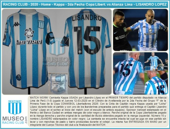 MATCH WORN! Camiseta Kappa USADA por Lisandro López en el PRIMER TIEMPO del partido disputado vs Alianza Lima de Perú (1-0) jugado el Jueves 12-03-2020 en el Cilindro de Avellaneda por la 2da Fecha del Grupo “F” de la Primera Fase de la Copa CONMEBOL Libertadores 2020!. Con la Cinta de Capitán negra Kappa usada por “Licha” López durante todo el partido y con uno de los banderines preparados para el partido que entrega el Capitán Lisandro “Licha” López en el sorteo al inicio del match (con el escudo de ambos equipos). Sponsor Aeroset estampado en el frente y del Banco Ciudad en ambas mangas de color negro y blanco. Parche original de la Copa Libertadores pegado en la manga derecha y parche original de la cantidad de títulos obtenidos pegado en la manga izquierda!. Número 15 y nombre LISANDRO estampados en color negro. La camiseta se encuentra intacta tal cual se jugo en ese partido sin lavar y con manchas de pasto y barro producidas durante el cotejo!. La misma fue ENTREGADA EN MANO por un integrante del Cuerpo Técnico del club a la finalización del MATCH!.